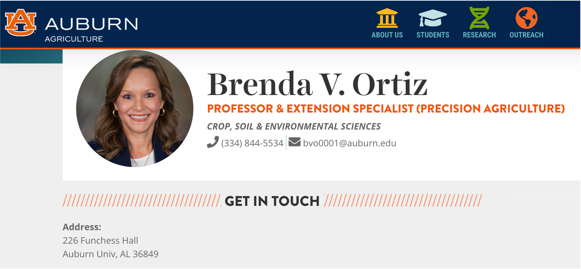 Dr. Brenda V. Ortiz is a Professor and Extension Specialist in Precision Agriculture at Auburn University's Department of Crop, Soil, and Environmental Sciences. With a Ph.D. in Biological and Agricultural Engineering from the University of Georgia, Dr. Ortiz has built a distinguished career focused on advancing digital agriculture, climate-smart irrigation strategies, and site-specific management practices for crop production.