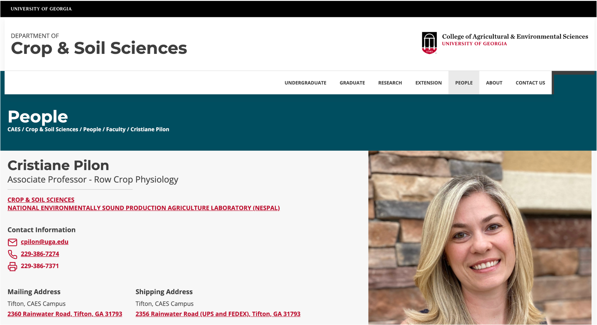 She is based at UGA's Tifton campus and is also affiliated with the National Environmentally Sound Production Agriculture Laboratory (NESPAL).
