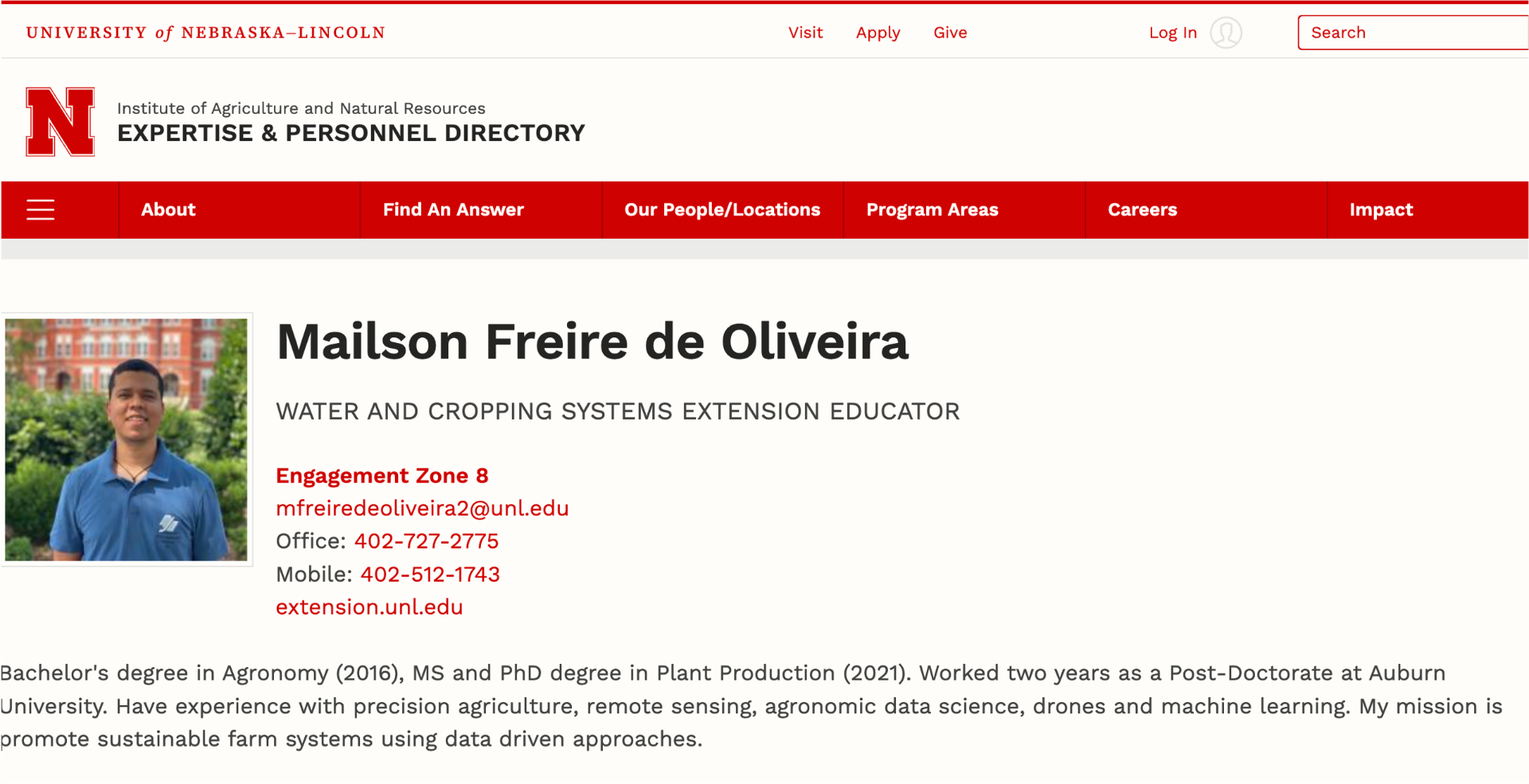 Dr. Mailson Freire de Oliveira is an Extension Educator in Water and Cropping Systems at the University of Nebraska–Lincoln, serving Dodge, Washington, and Cuming counties. His work focuses on promoting sustainable farming systems through data-driven approaches and the integration of advanced technologies.